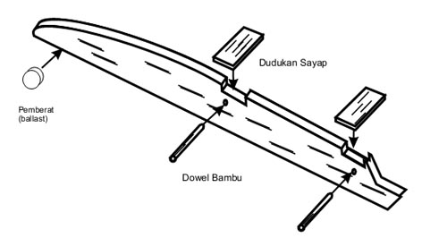 Rekatkan dudukan sayap pada badan pesawat di celah yang disediakan. Pastikan dudukan sayap terpasang tegak lurus terhadap badan dan ekor vertikal. Letakkan sayap pada dudukannya pada badan, gunakan 2 utas karet gelang untuk mengikat sayap ke badan.