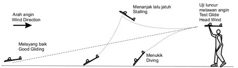 Pesawat yang terbang melayangnya berputar ke kanan perlu dilemparkan memotong angin sekitar 10-15 derajat ke arah kiri, sebaliknya pesawat yang diset untuk terbang berputar ke kiri, harus dilemparkan memotong arah angin ke arah kanan.