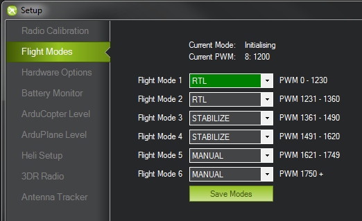 2. Anda dapat memilih mode penerbangan yang berbeda di udara dengan pemancar RC toggle switch, yang harus dihubungkan ke APM INPUT 1. Ketika memindahkan toggle switch, akan terlihat perubahan sorot hijau untuk garis yang berbeda. Anda dapat menggunakan menu drop-down pada setiap baris untuk menetapkan mode tersebut ke fungsi.