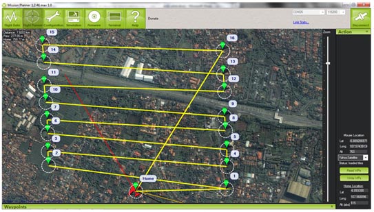 2. Create WayPoint. WayPoint dapat dibuat dengan manual atau otomatis dengan Flight Planner. Beberapa yang harus diperhatikan dalam membuat WayPoint diantaranya yaitu ketinggian terbang, jarak antara WayPoint dan urutan lokasi sebagai WayPoint.
