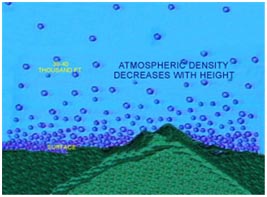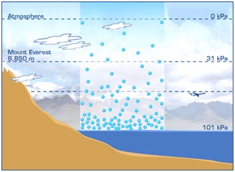 The atmosphere consists of five layers, held around the planet by the force of gravity. As you move upwards through the layers, atmospheric pressure decreases rapidly with height and the air temperature also changes. It is these, more complicated, changes in temperature which are used to divide the atmosphere into the layers described below.