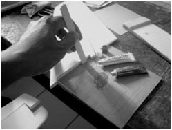 Lapiskan Epoxi yang sudah dicampur secara seksama dengan perbandingan 1:1 secara merata ke bagian yang terbuka di bagian tengah ekor horizontal dan ke lubang dudukan stabilizer di badan pesawat bagian belakang.