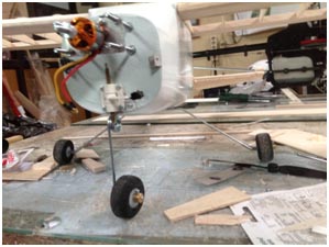 Tangkai roda pendarat utama sebanyak tiga batang baja 2mm dipasangkan pada posisi yang diinginkan di sisi bawah badan. Dudukan roda pendarat dari kayu keras sudah disiapkan dan pergunakan obeng panjang serta 8 buah baut dan mur 3 mm untuk menguncinya dengan kuat tangkai roda sehingga tidak mudah bergerak atau terlepas.