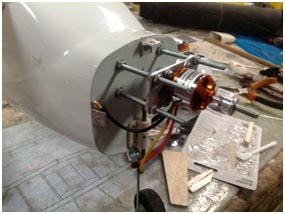 1. Pasangkan motor pada dudukannya di hidung pesawat, lalu pasangkan propeller dan spinner pada motor.