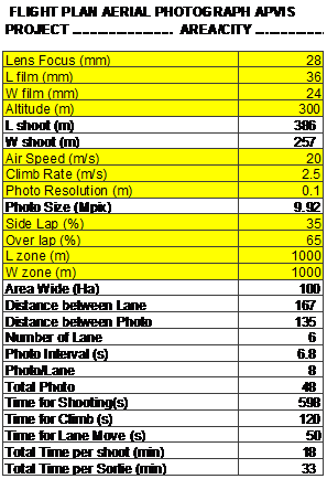6. Run Flight Plan for Aerial Photo to get altitude, time interval, flight lane interval. The following form may be used and helpfull during the flight