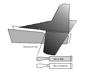 Pasangkan ekor horizontal (stabilo) pesawat yang sudah dicover dengan film ke bagian belakang badan dengan lem Epoxi. Dengan pisau cutter bukalah film yang melapisi ekor yang akan direkatkan ke badan. Pastikan bahwa ekor ini sejajar dengan bidang sayap atau dudukan sayap pada badan. Ekor vertikal (Fin) harus dipasang dan dilem dengan epoxi pada ekor horizontal dan posisinya tegak lurus dengan bidang sayap. Kemudi naik atau elevator dipasangkan pada ekor horizontal dengan merekatkan engsel ke celah yang dibuat pada ekor tersebut dengan epoxi.