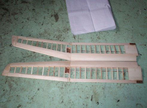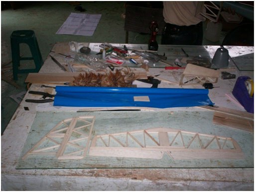 1. Lekatkan suatu landasan yang rata sebagai alas untuk bekerja. Pasang gambar rencana sehingga bagian ekor berada pada posisi yang tepat untuk dirakit. Rekatkan dengan isolasi lapiskan sebuah atau selembar plastik diatas gambar tersebut untuk mencegah terkena lem pada saat perakitan.