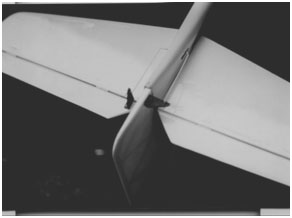 • Tempatkan pushrod di tempat sesuai seperti pada gambar disamping ini, buatlah bengkokan sebanyak yang diperlukan. Dengan bekerja dari kabin, masukan pushrod untuk rudder melalui badan bagian belakang dan keluar di lubang ini. Satu benang untuk menuntun keluarnya kawat ke lubang keluaran.
