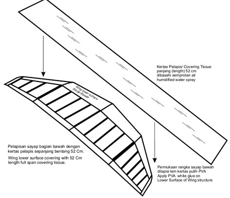 Untuk melapisi permukaan sayap bawah gunakan kertas pelapis yang panjangnya 52 Cm yaitu sepanjang bentang sayap Pelangi 50.