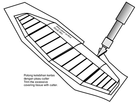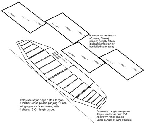 Untuk pelapisan permukaan sayap atas pergunakan 4 lembar kertas pelapis yang panjangnya sekitar 13 Cm yaitu sepanjang panel-panel sayap. Lapiskan kertas ini ke masing-masing panel dan pastikan terdapat overlap sekitar 3 mm yang diberi lem PVA.